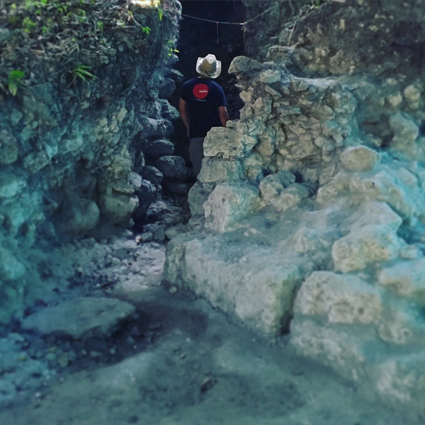 Back at structure 34, the discovery of a large, hollow space beneath the lowest level of construction raised great excitement. It contained an elite burial, alongside grave goods such as jade and pottery vessels. Things were covered in a thick layer of rock fall from the roof.